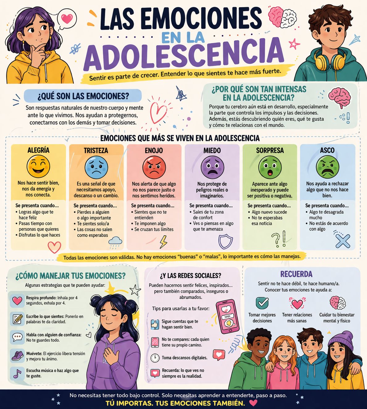 Un espacio interactivo donde los adolescentes explorarán sus emociones desde situaciones reales de su vida diaria (escuela, familia, redes sociales), desarrollando habilidades para entenderlas, expresarlas y manejarlas de forma saludable.